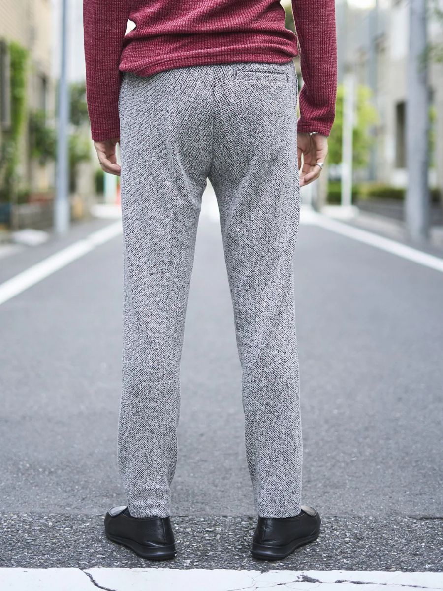 ポリエステル・ポリウレタンの起毛ストレッチ素材を使用し、快適な穿き心地と美しいシルエットを両立したスラックス。表面はメランジ調の起毛感があり、あたたかみのある風合いを演出。さらにヘリンボーン調の織り柄が加わることで、上品でクラシカルな印象を持たせています。きれいめなジャケットスタイルにも相性が良いので、幅広いスタイルに大活躍。落ち着いた雰囲気と快適さを兼ね備えた、大人のためのアイテムです。