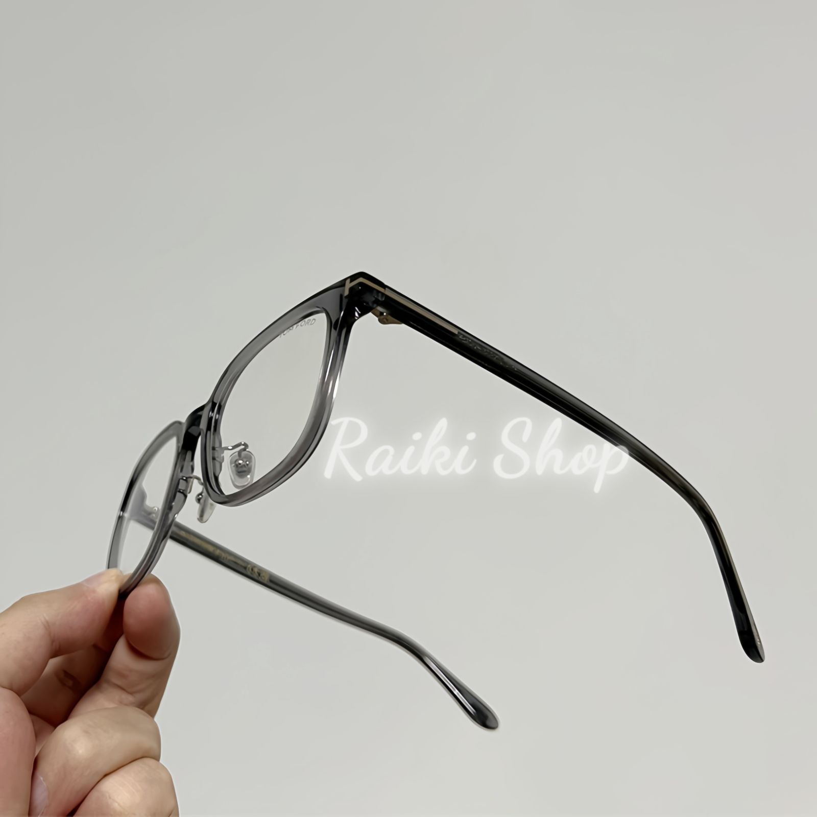 やや細身でシャープな印象のビッグシェイプなウェリントンフレーム。鼻パッドは調整可能なクリングスタイプを採用。テンプルエンドにはTOM FORDの刻印が入ったメタルパーツをあしらい、さりげない高級感を演出します。