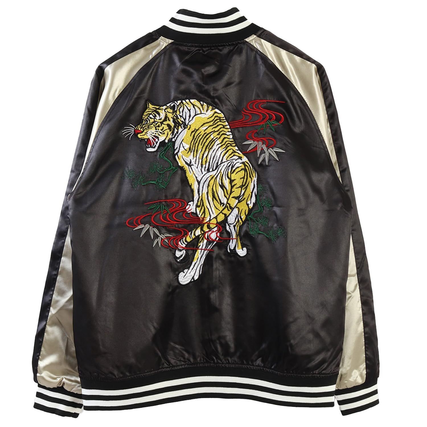 LL_11.ブラック×ゴールド 虎刺繍 WESTSEA 和柄刺 スカジャン メンズ レディース ブランド ウエストシー アウター薔薇 虎 舞子 風神 雷神 鷹 龍 狼 刺繍 おしゃれ ストリートファッション スタジャン ジャケット ブルゾン LL