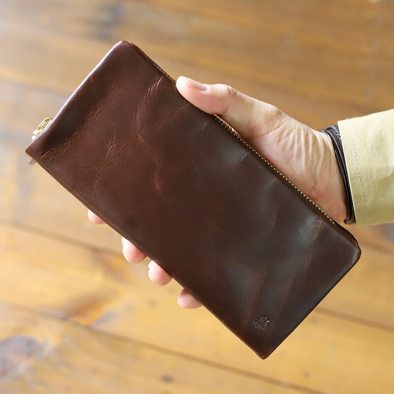 ◇素材にはオイルアッププル加工を施したバッファローレザーを使用しています。厚くて丈夫で自然なツヤと柔らかさがあり、しっとりとした質感と深みのある光沢が魅力。傷が目立ちにくく、なじみやすく、色ムラやシワが風合いとして表れる「プルアップ効果」が特徴で、使い込むほどに味わいが増す革ならではのエイジングもお楽しみ頂けます。