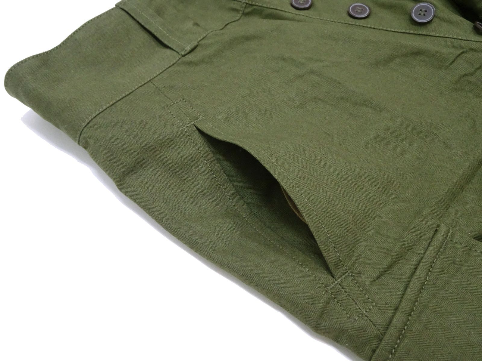裾に配されたボタン留めサイズアジャスター、味わい深いヘリンボーンツイルの生地感など、