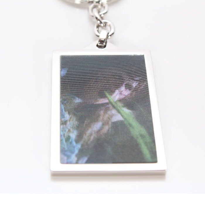 ・レンチキュラーグラフィックとデボス加工ロゴの金属製キーチェーン。
