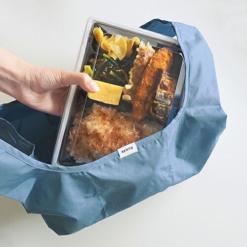 コンビニのお弁当が傾かずに入るマチが広めのエコバッグ。タグ部分のBENTOの文字がアクセントになっています。【検索ハッシュタグ】#エルコミューン#エコバッグ#買い物袋#バッグ#鞄#LAURIER#BENTO#スモークブルー#青