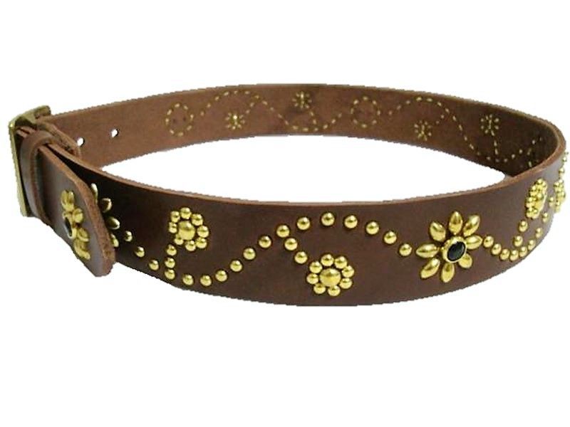 栃木レザー フラワー型スタッズベルト 真鍮 ブラス チョコ ブラックスポッツ 真鍮製スクエアバックル 40mm幅 一枚革