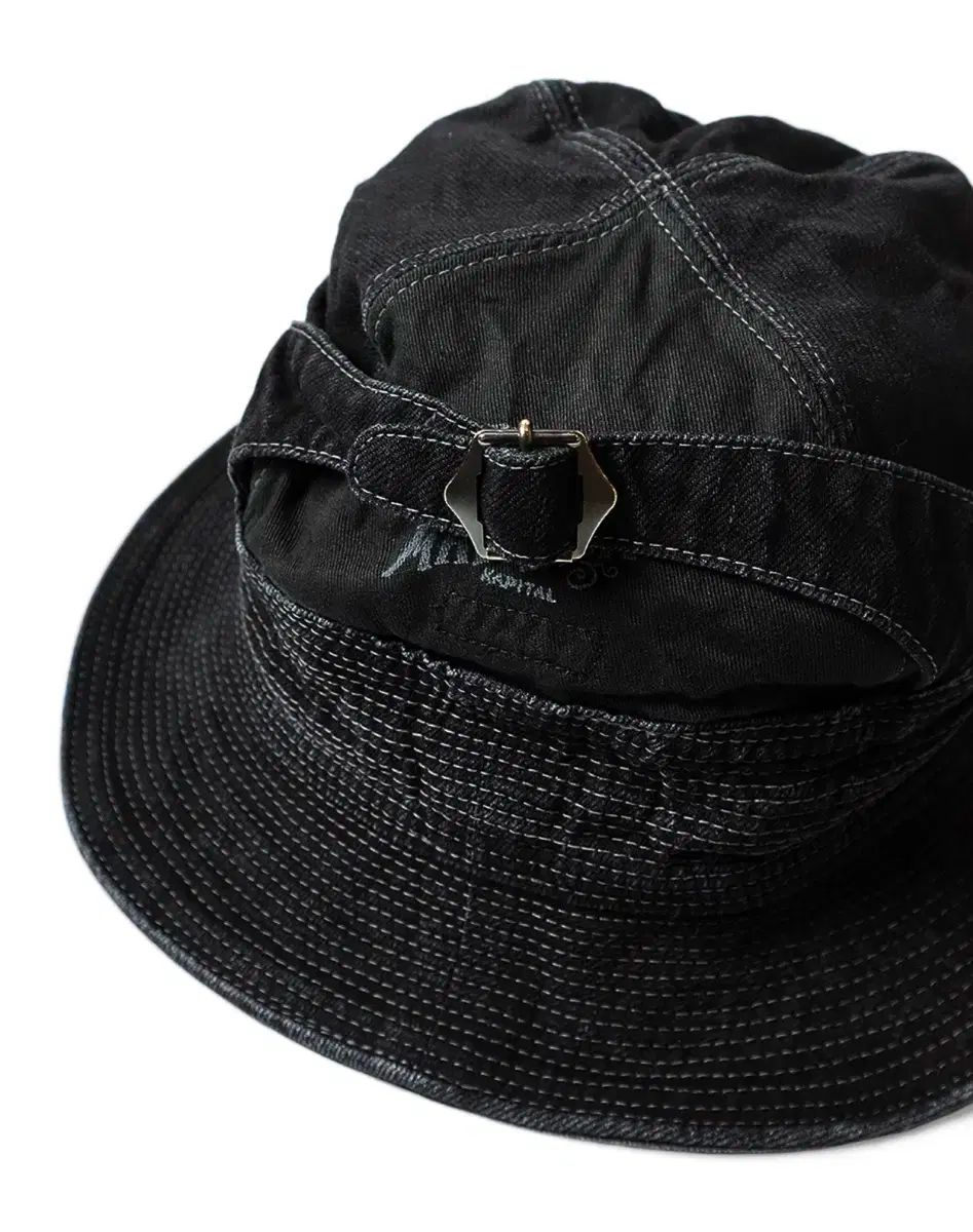 ブラックデニムの老人と海HAT。ブラックデニムは緯糸と緯糸に黒で染色された糸を使用して織り上げています。裾の端から端までの全ての面とクラウンの半分以上の面を埋める無数のステッチは、補強と装飾を兼ねています。