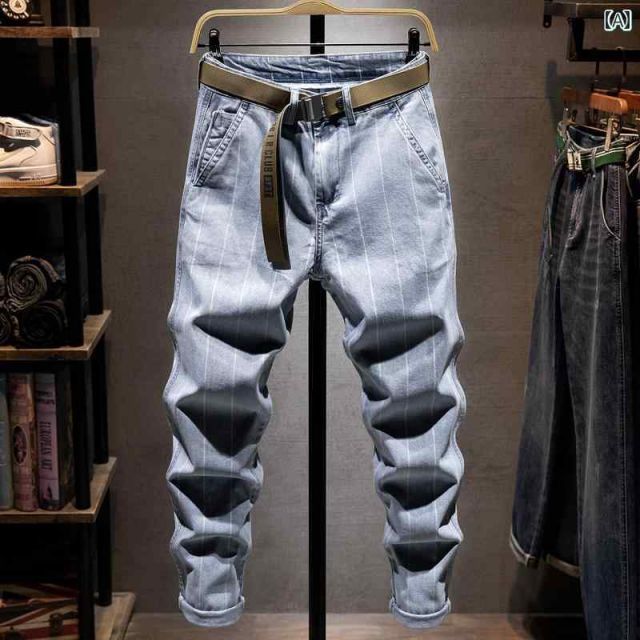 メンズ 男性用 ファッション オシャレ シンプル 大人 かっこいい ストリート ヒップホップ HipHop ライト ジーンズ ウォッシュ ストライプ ストレッチ ルーズ フィットパンツ 夏 薄手