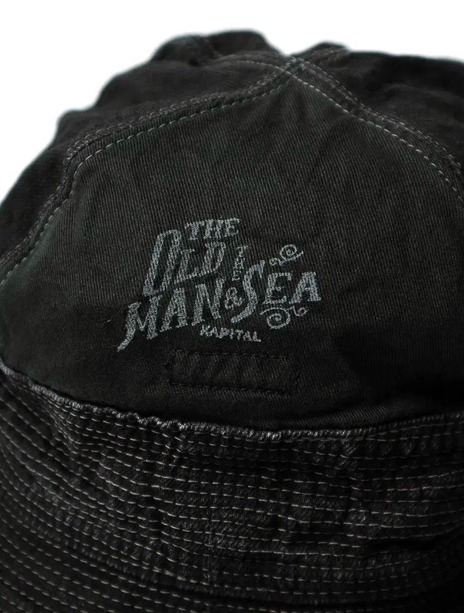 ブラックデニムの老人と海HAT。ブラックデニムは緯糸と緯糸に黒で染色された糸を使用して織り上げています。裾の端から端までの全ての面とクラウンの半分以上の面を埋める無数のステッチは、補強と装飾を兼ねています。