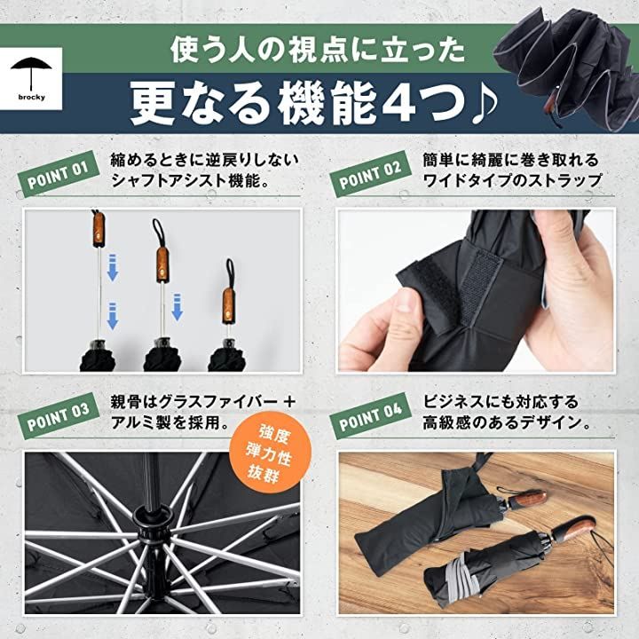 「使う人の視点に立った更なる機能4つ*」v縮める時に逆戻りしないシャフトアシスト機能 v簡単に綺麗に巻きとれるワイドタイプのストラップ v親骨はグラスファイバー+アルミ製を採用 vビジネスにも対応する高級感のあるデザイン