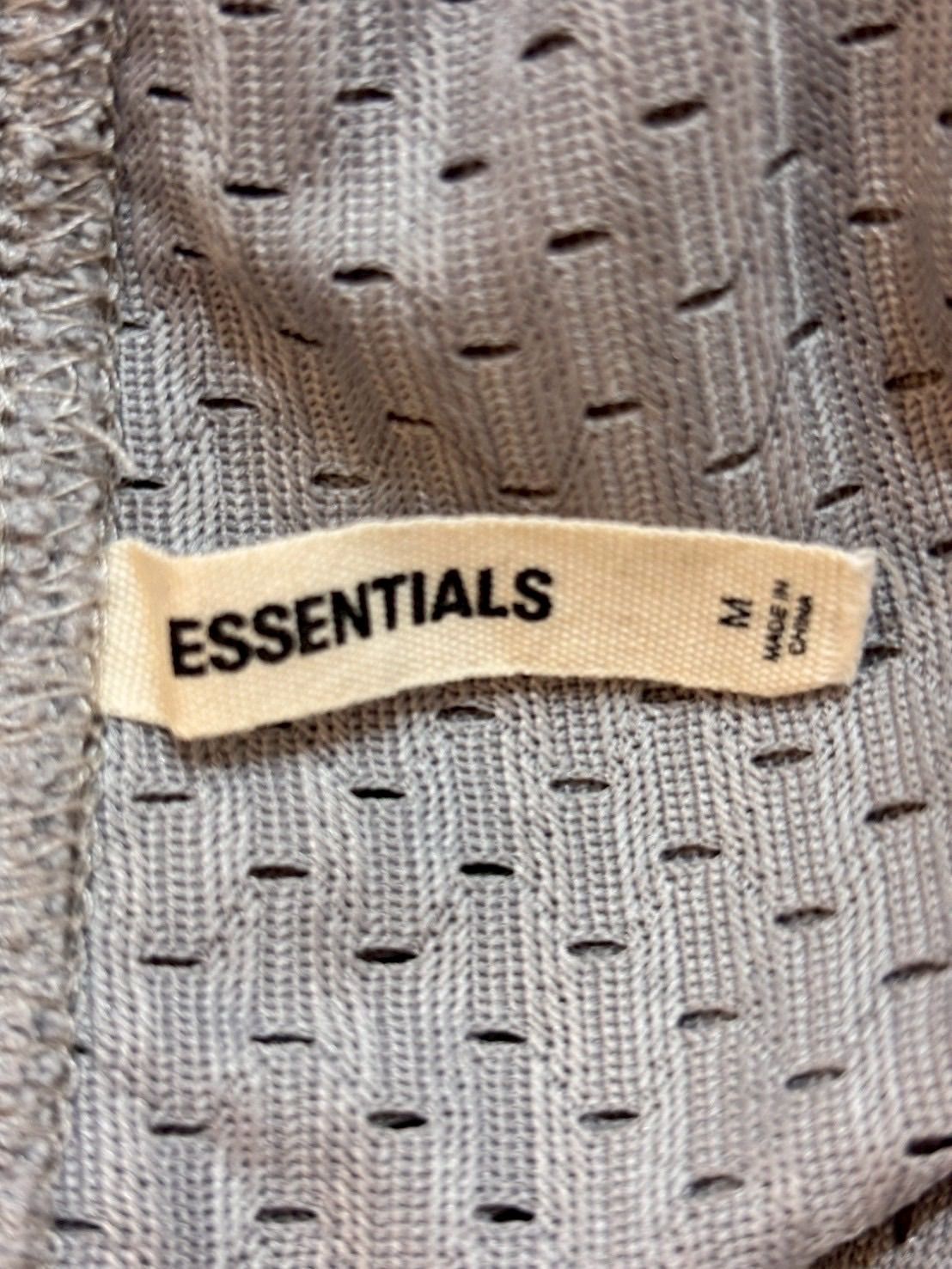 メッシュ素材のグレーのショートパンツ、Mサイズ、ESSENTIALSロゴ入り。