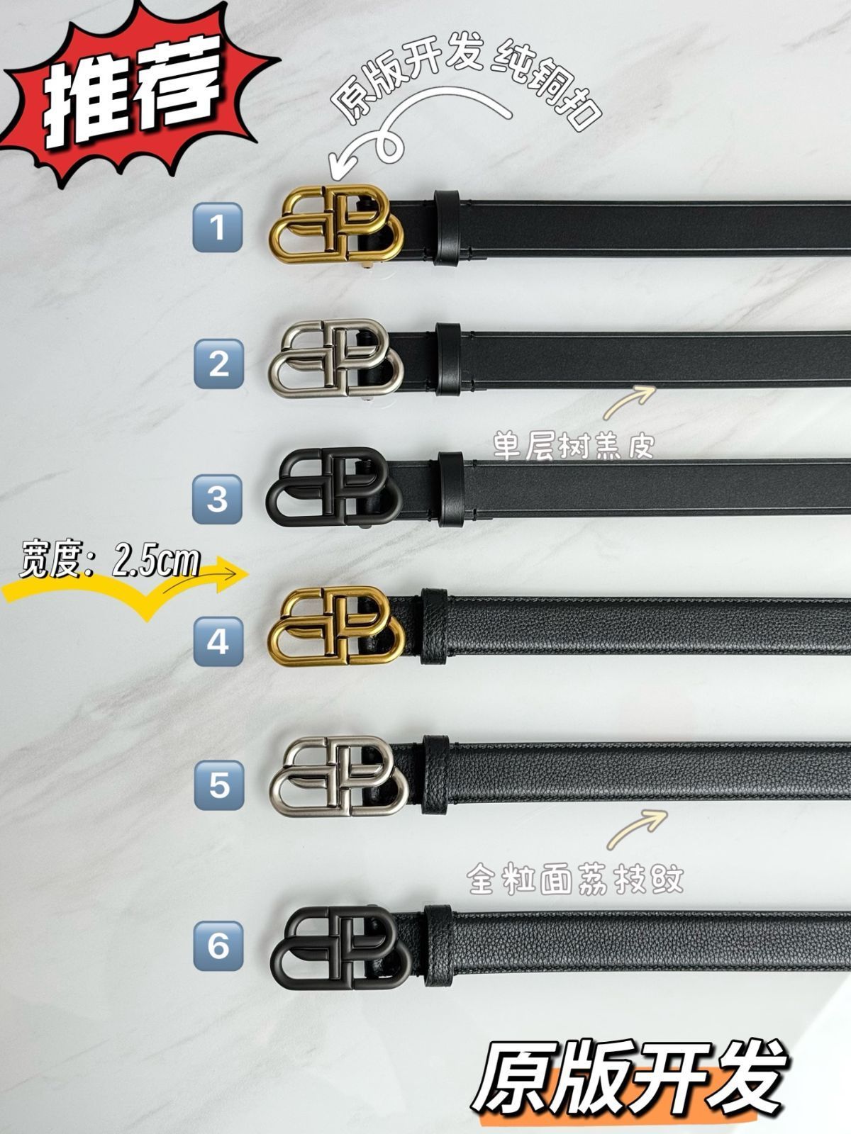 素材には輸入の小牛皮を使用しており、柔らかい肌触りと優れた耐久性を兼ね備えています。金具は純銅製の復古風デザインを採用しており、全体的な高級感と魅力を高めています。幅 2.5cm のコンパクトなデザインで、さまざまな服装に合わせやすい百搭なアイテムです。