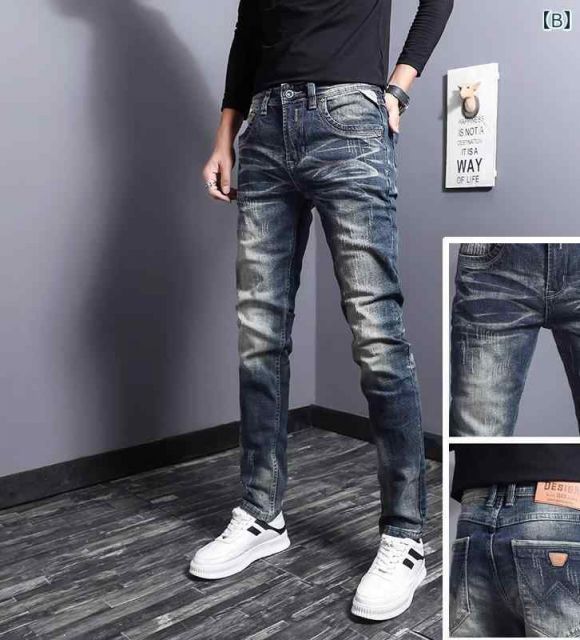商品名:[32]メンズ ファッション 服 オシャレ シンプル 大 かっこいい 大きいサイズ ストリート 紳士服 春 秋 レトロ ブルー ウォッシュ加工 ジーンズ スリムフィット パッチ ロング パンツ