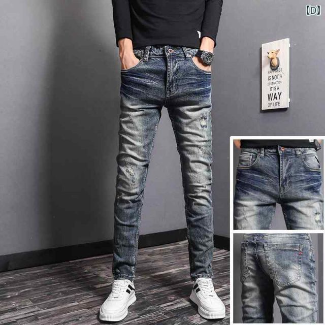 30 メンズ ファッション 服 オシャレ シンプル 大 かっこいい 大きいサイズ ストリート 紳士服 春 秋 レトロ ブルー ウォッシュ加工 ジーンズ スリムフィット パッチ ロング パンツ