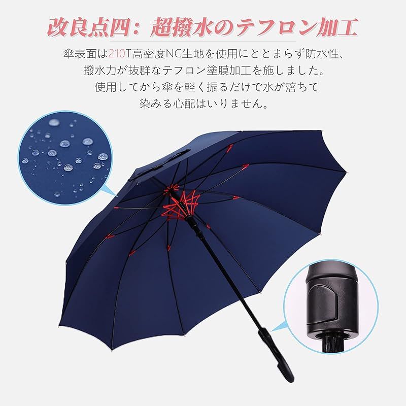 【グラスファイバー材質 】長傘の中棒には高強度のグラスファイバーという材質を採用し、頑丈さ、錆びないという二つの特徴を持ちます。それに、中棒を太くして、すこし重さがありますが、耐風性を倍に増加しており、強い風もしなやかに受け流してくれて折れにくくなっています。