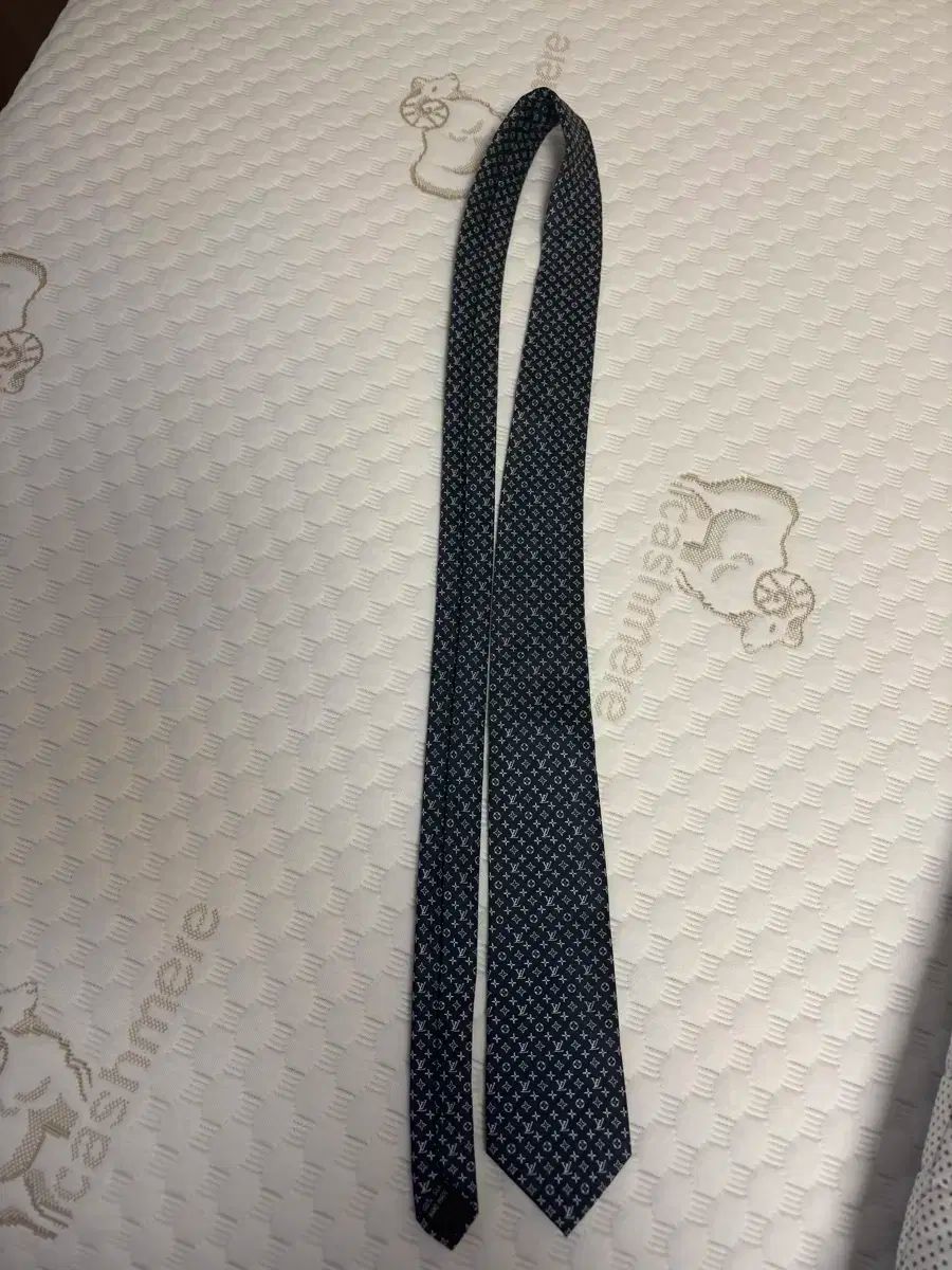これはネイビーのルイヴィトンネクタイです。ルイ・ヴィトンのロゴパターンがさりげなく入っています。シルク素材が高級感をプラスします。