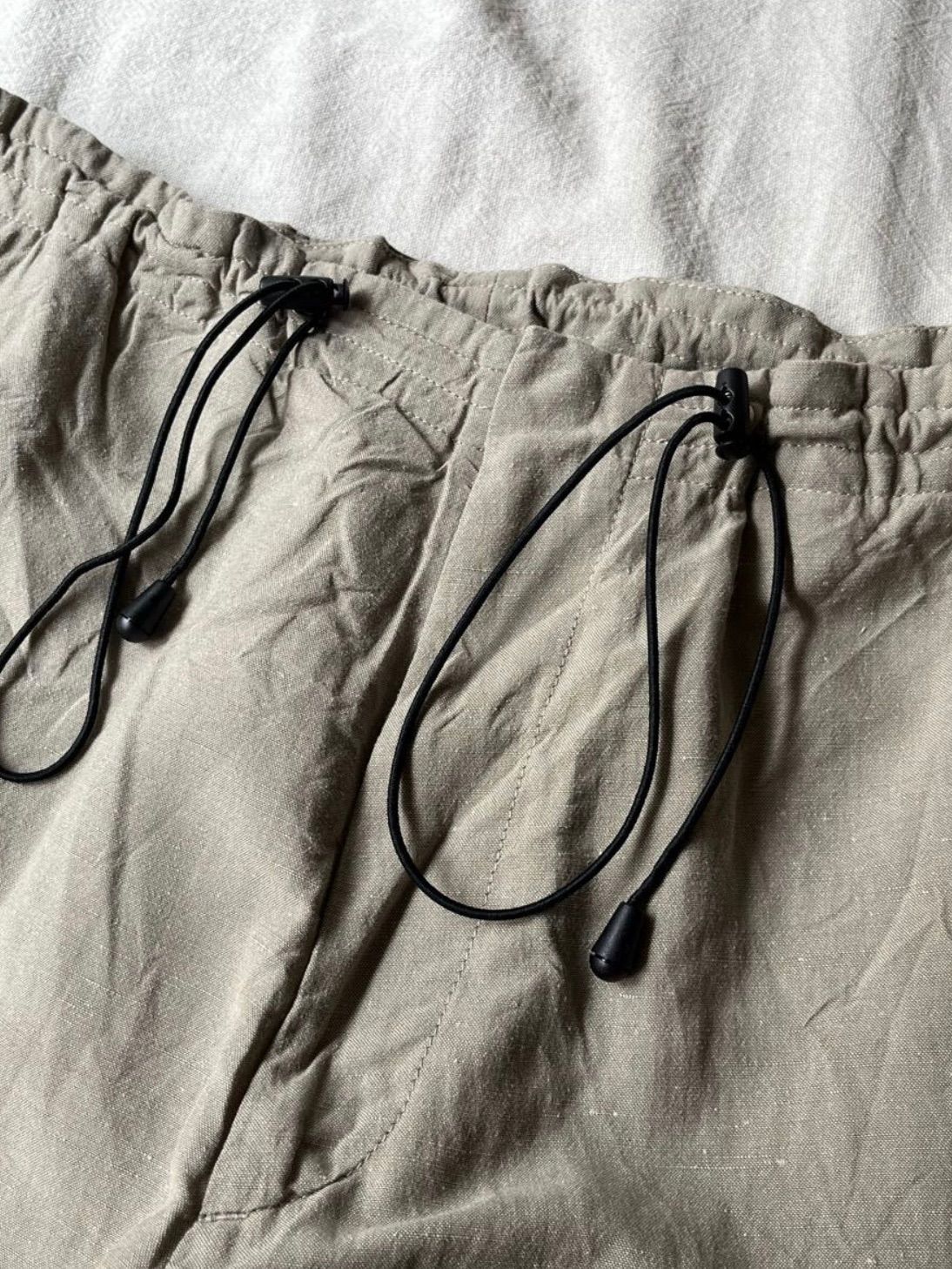 上品なベージュの生地は、65%リネン×35%コットンの混紡。リネン特有のシャリ感と、コットンの柔らかさがほどよく溶け合い、穿き込むほどに自然な風合いが増していきます。