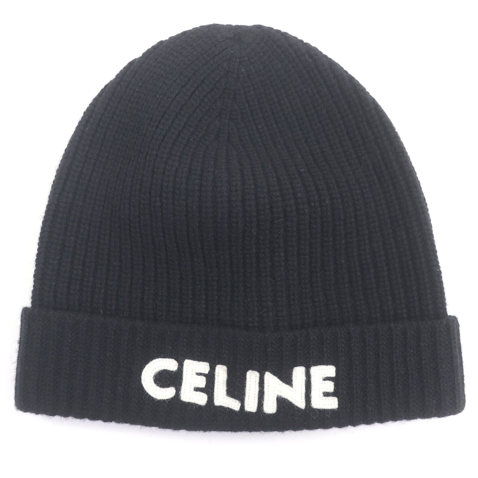 □CELINE セリーヌ ウール100% ロゴワッペン ビーニー ニットキャップ ニット帽 ブラック TU イタリア製 メンズ