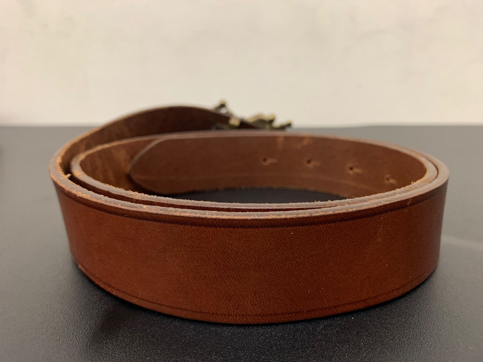 真鍮製の立体バックルが印象的なレザーベルトです。